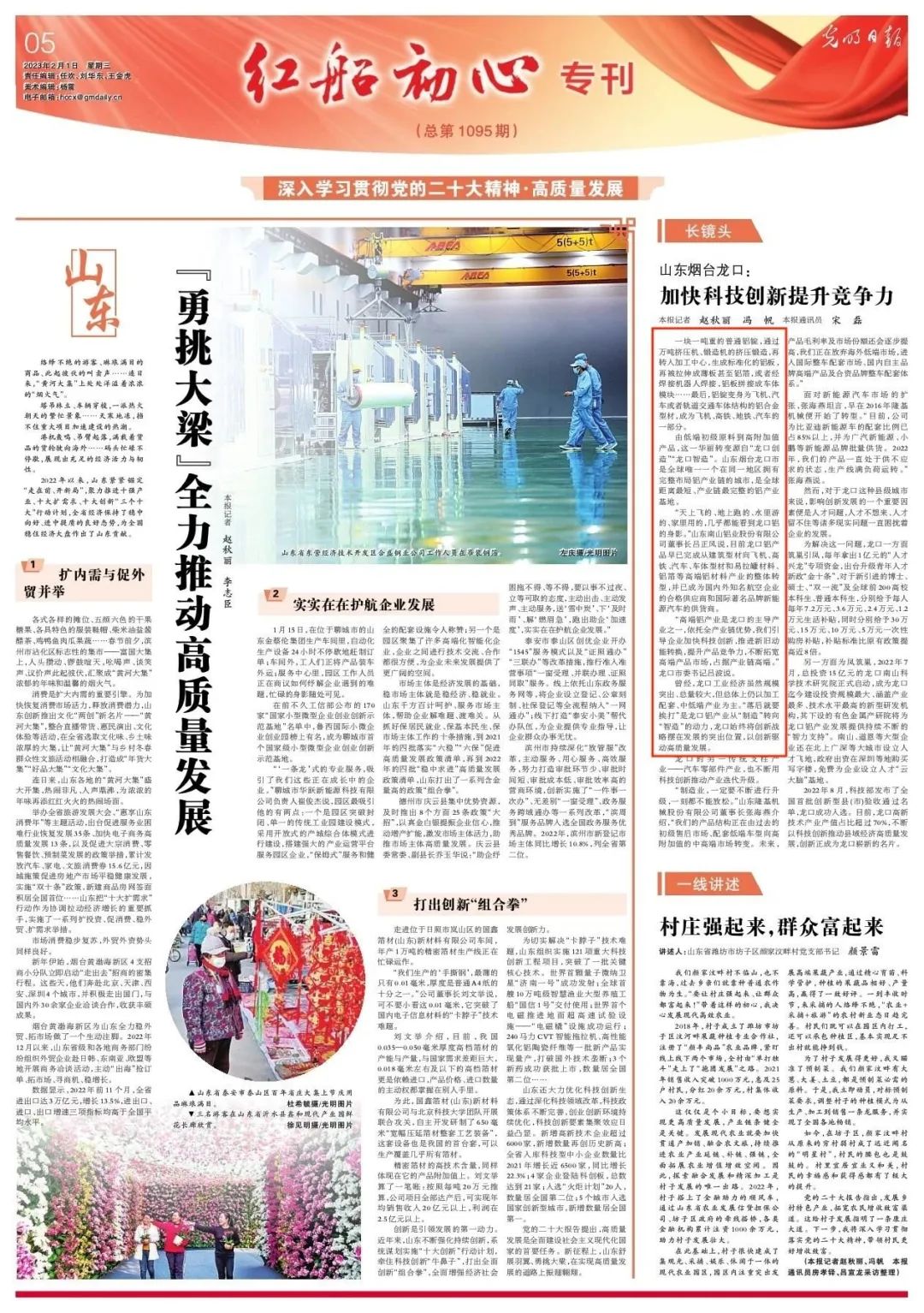 2月1日,《光明日報》“紅船初心”專刊整版聚焦山東《“勇挑大梁”全力推動高質量發展》,南山鋁業作為龍口市行業龍頭企業代表被權威報道。