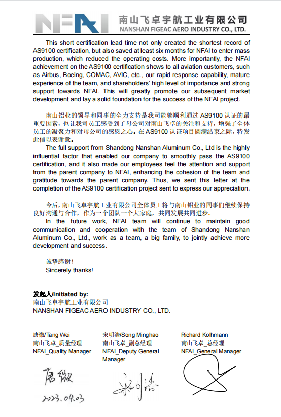 與此同時,吃水不忘挖井人,南山飛卓向母公司“南山鋁業(yè)管控中心”發(fā)來了感謝信,對母公司認(rèn)證團隊給予的全力支持和專業(yè)的指導(dǎo)表示感謝,同時表達(dá)將以此通過認(rèn)證為契機,在后續(xù)的工作中,將持續(xù)與母公司保持良好的溝通,相互學(xué)習(xí),共同進步,不斷地提升公司核心競爭力,為公司在航空市場發(fā)展領(lǐng)域做出更大的貢獻。
