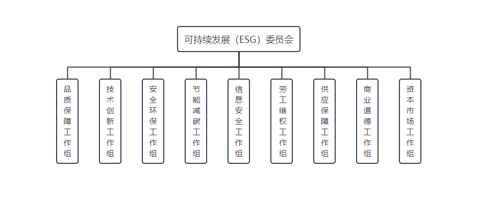 可持續發展(ESG)委員會下設9個工作組,負責具體執行委員會相關決議,定期評審和更新管理體系可持續發展中長期規劃階段目標,并有效地落實各項實施策略。各工作組具體職責如下: