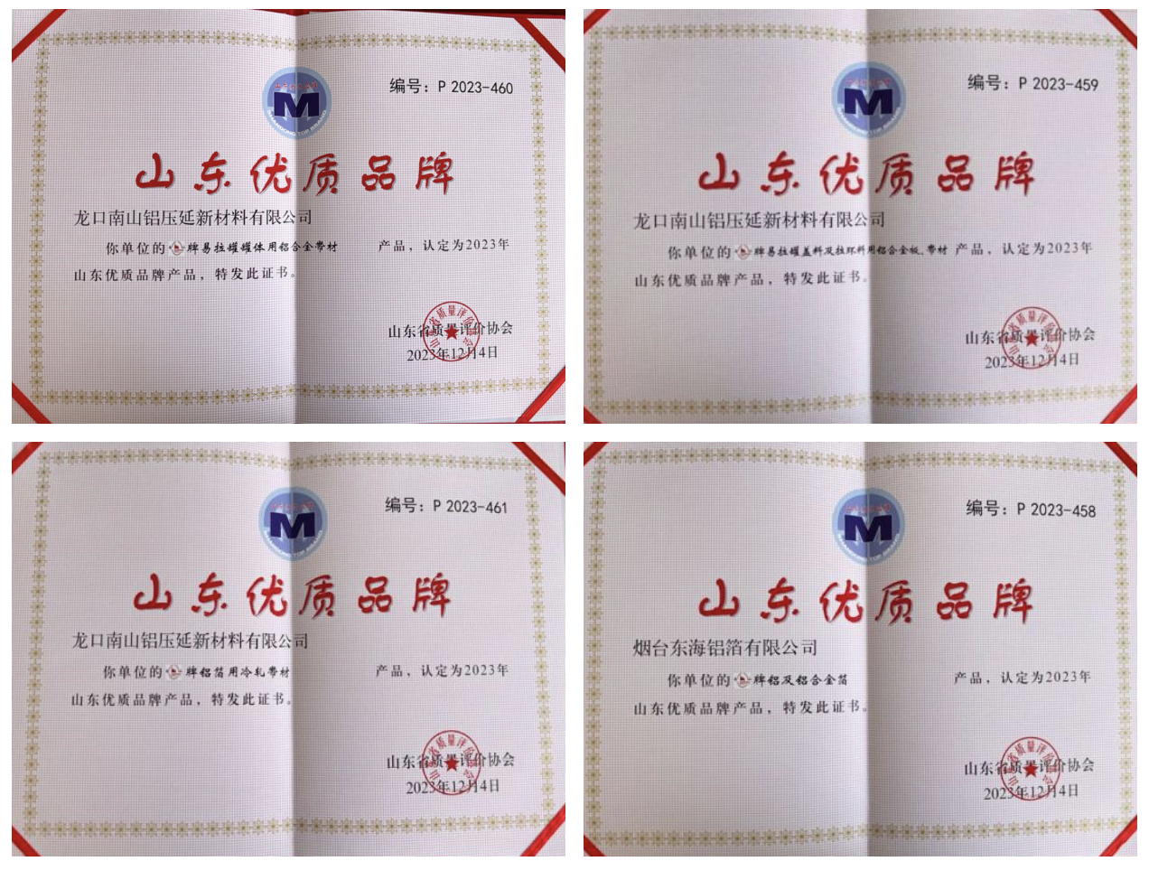 其中,南山鋁業被山東省質量評價協會評定為山東省優質品牌的產品有:“南山牌易拉罐罐體用鋁合金帶材”“南山牌易拉罐蓋料及拉環料用鋁合金板、帶材”“南山牌鋁箔用冷軋帶材”及“南山牌鋁及鋁合金箔”等。