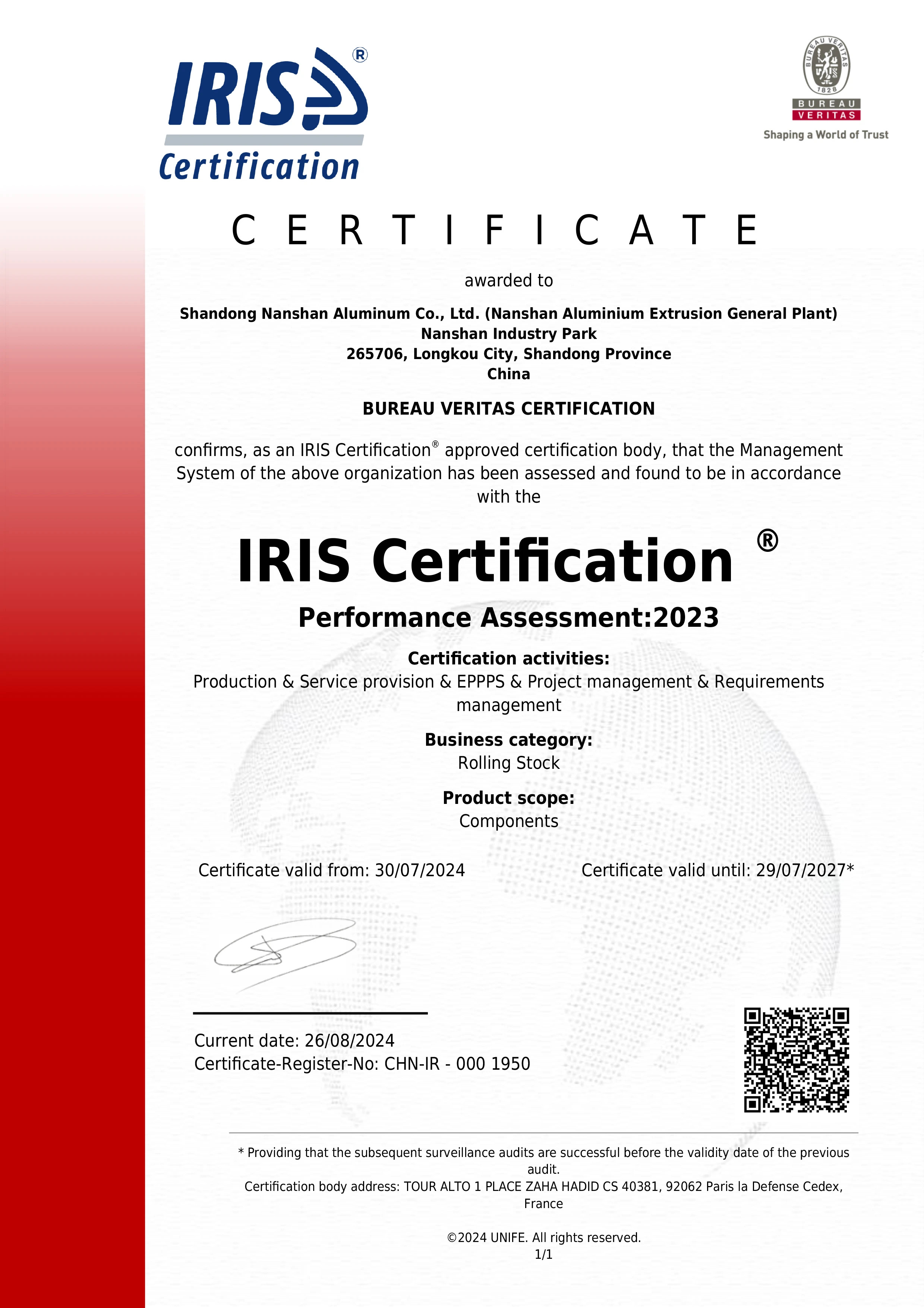 在認證準備過程中,南山鋁業管控中心體系認證部組織南山鋁材各部門人員認真學習標準,使用IRIS審核評估專用打分表識別關鍵差距項,指導逐條制定改進行動計劃,推進整改措施有效實施。內審組進行了多輪循環預審,最終以審核得分達到IRIS認證規則的銀牌標準獲得銀牌認證,并贏得了認證機構專家團隊的一致贊譽,為公司軌道交通客戶提交了滿意的答卷。