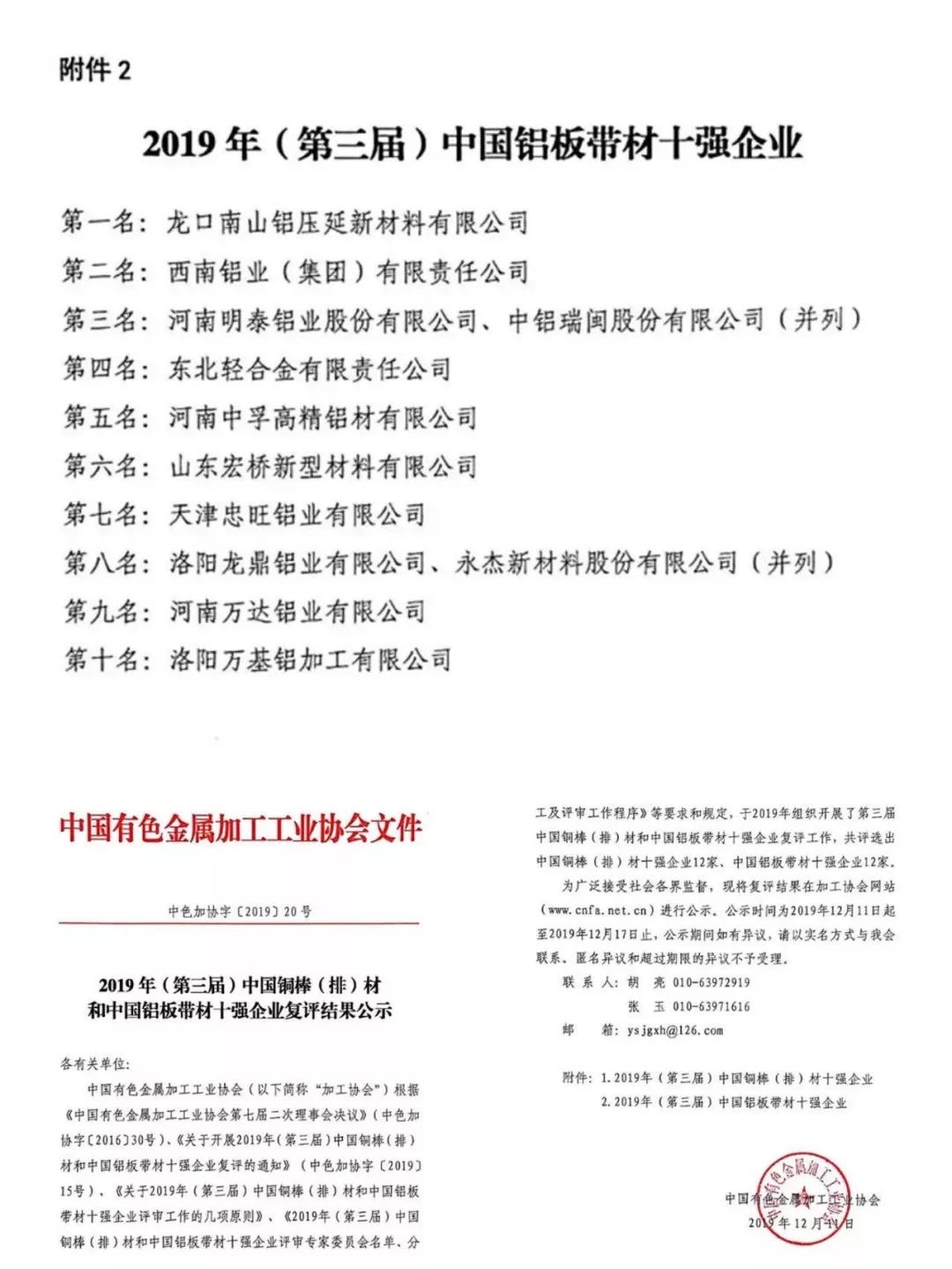 近日,中國有色金屬加工工業協會公布了“中國鋁板帶材十強企業”公示名單,龍口南山鋁壓延新材料有限公司入選榜單,位居十強企業之首。