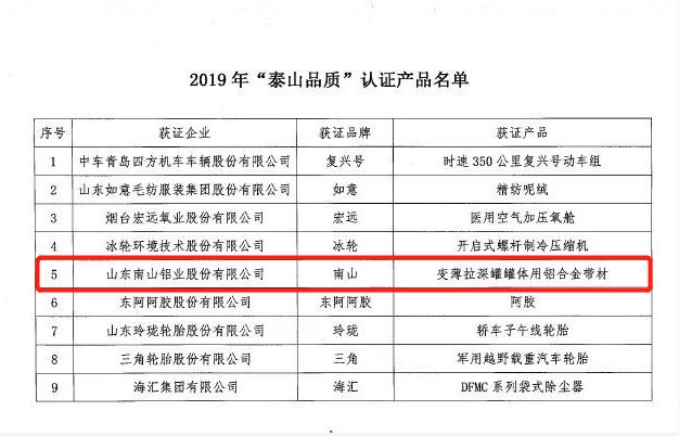 12月25日,“泰山品質”認證聯盟公布了《2019泰山品質認證名單》,山東南山鋁業股份有限公司生產的“變薄拉深罐罐體用鋁合金帶材”產品榜上有名。